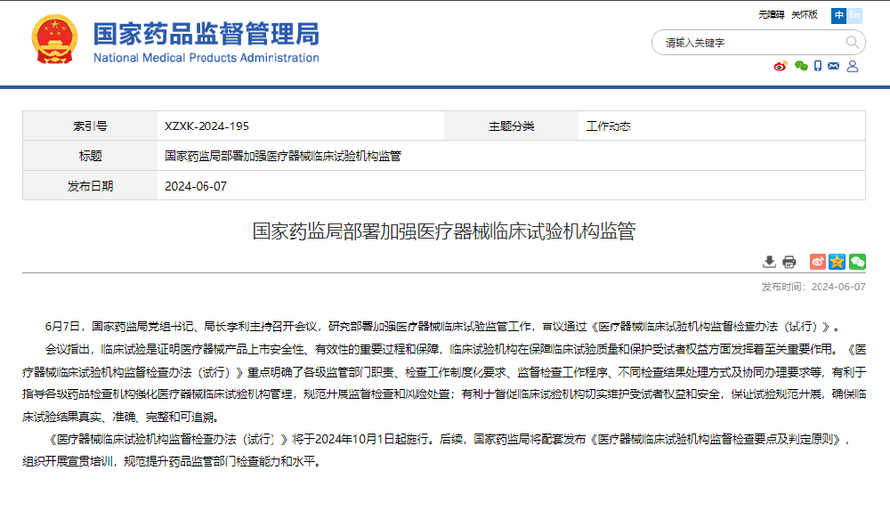國(guó)家藥監(jiān)局部署加強(qiáng)醫(yī)療器械臨床試驗(yàn)機(jī)構(gòu)監(jiān)管,6月7日,國(guó)家藥監(jiān)局黨組書(shū)記、局長(zhǎng)李利主持召開(kāi)會(huì)議,研究部署加強(qiáng)醫(yī)療器械臨床試驗(yàn)監(jiān)管工作,審議通過(guò)《醫(yī)療器械臨床試驗(yàn)機(jī)構(gòu)監(jiān)督檢查辦法(試行)》。